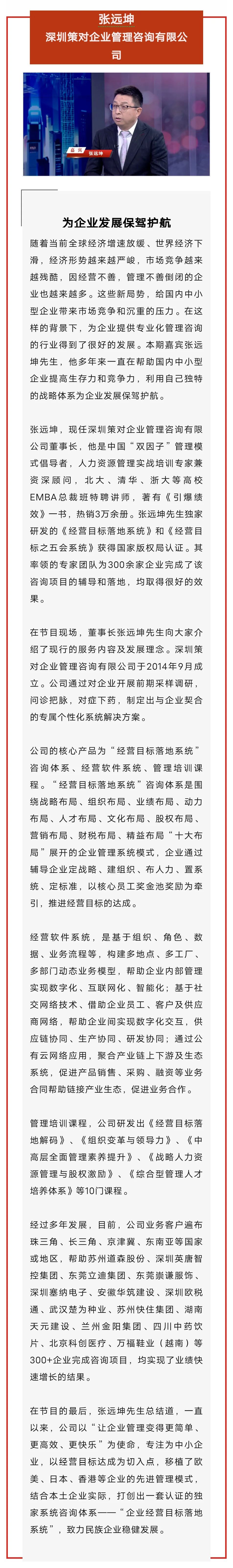日前,策对咨询董事长张远坤老师接受了央视旗下栏目《信用中国》专访,做客演播厅与央视知名主持人姚雪松面对面。